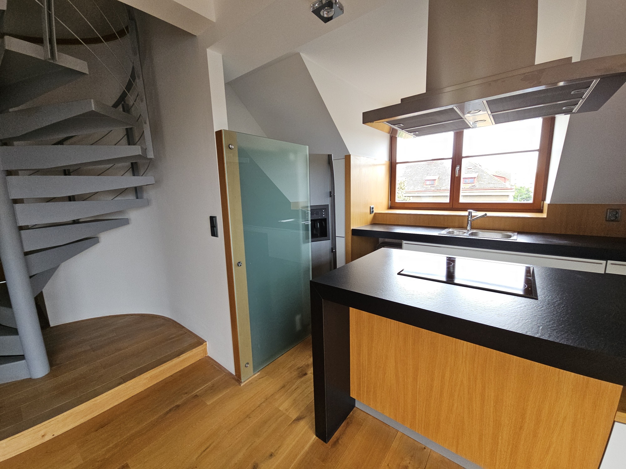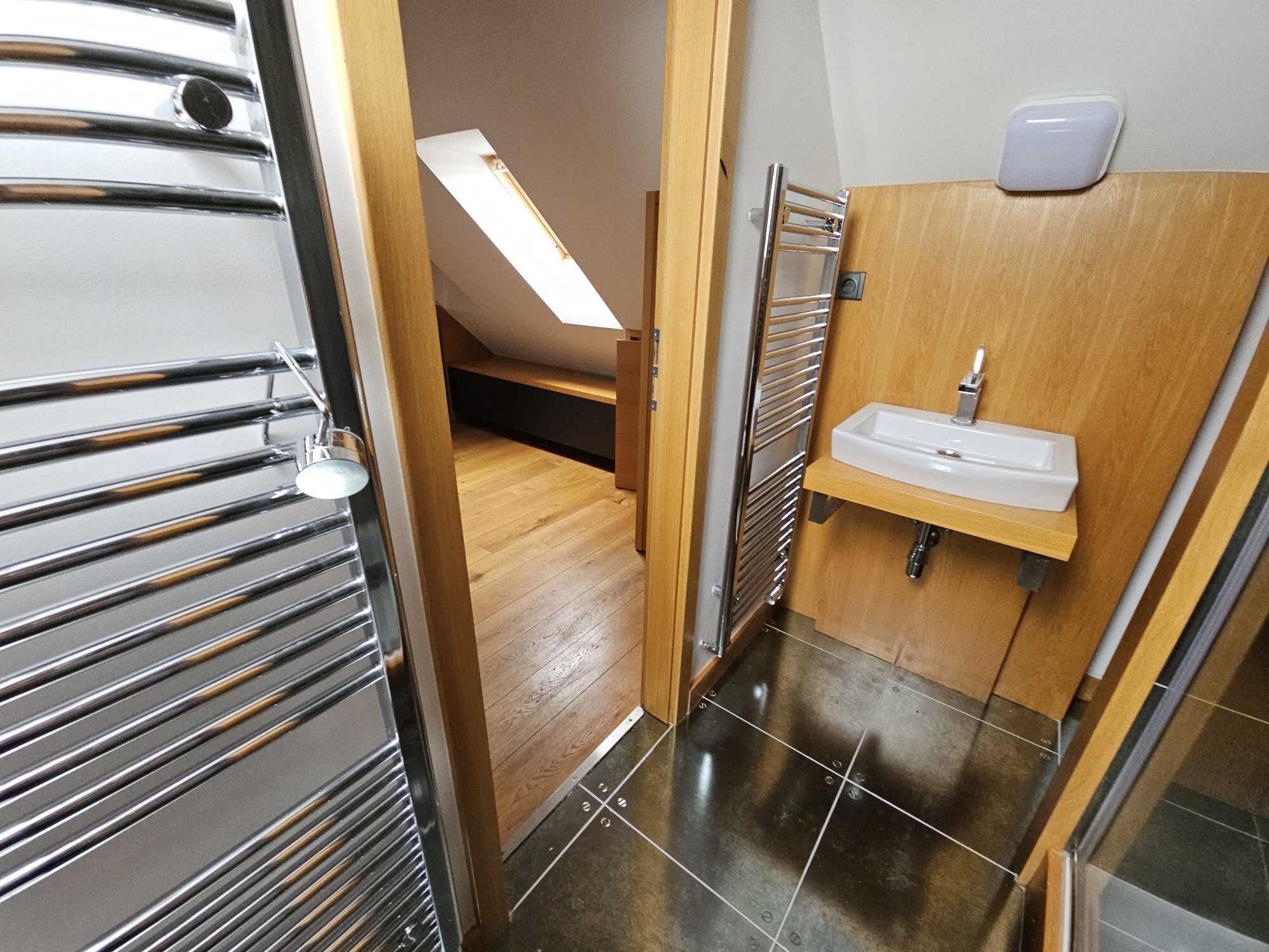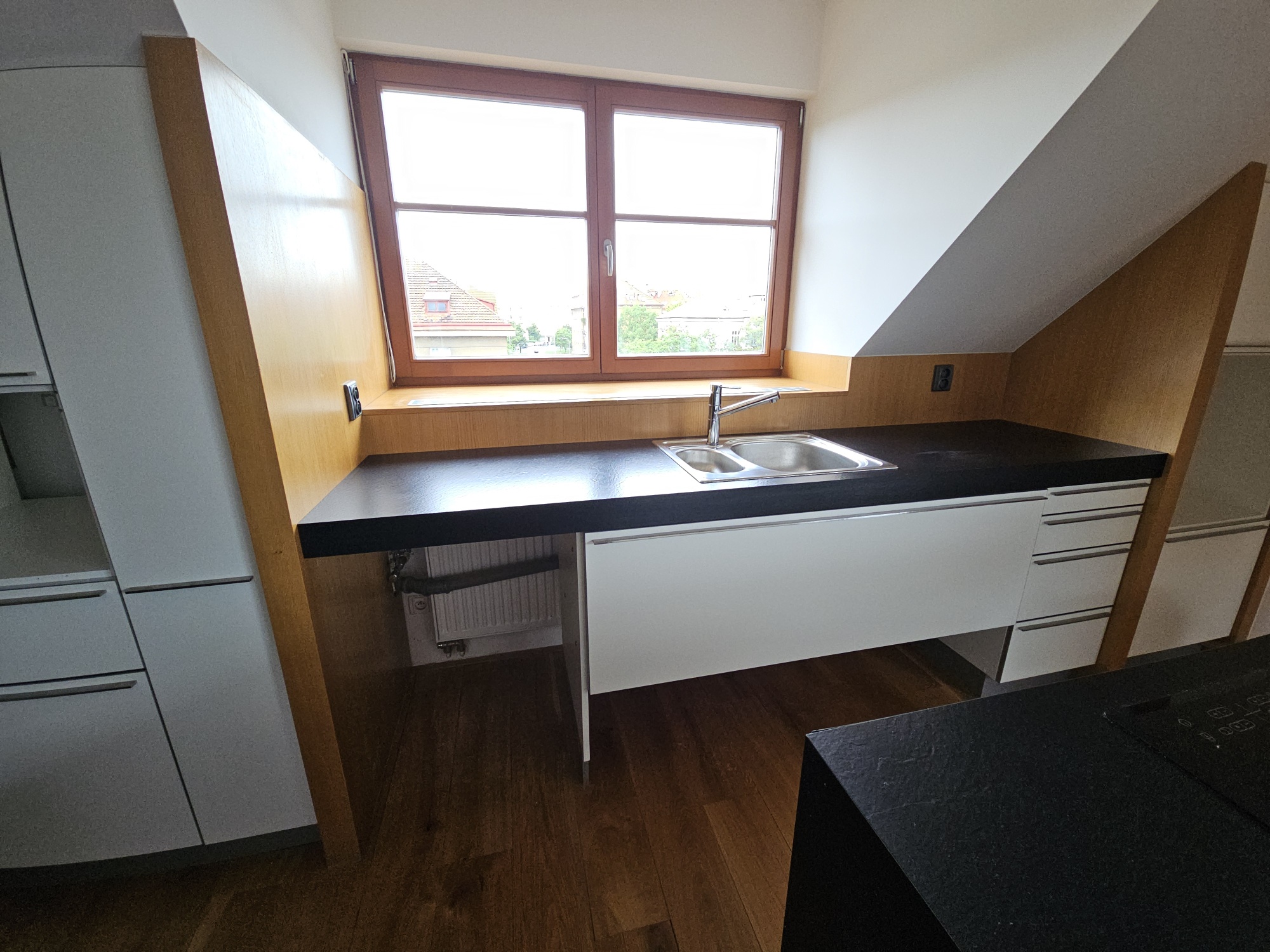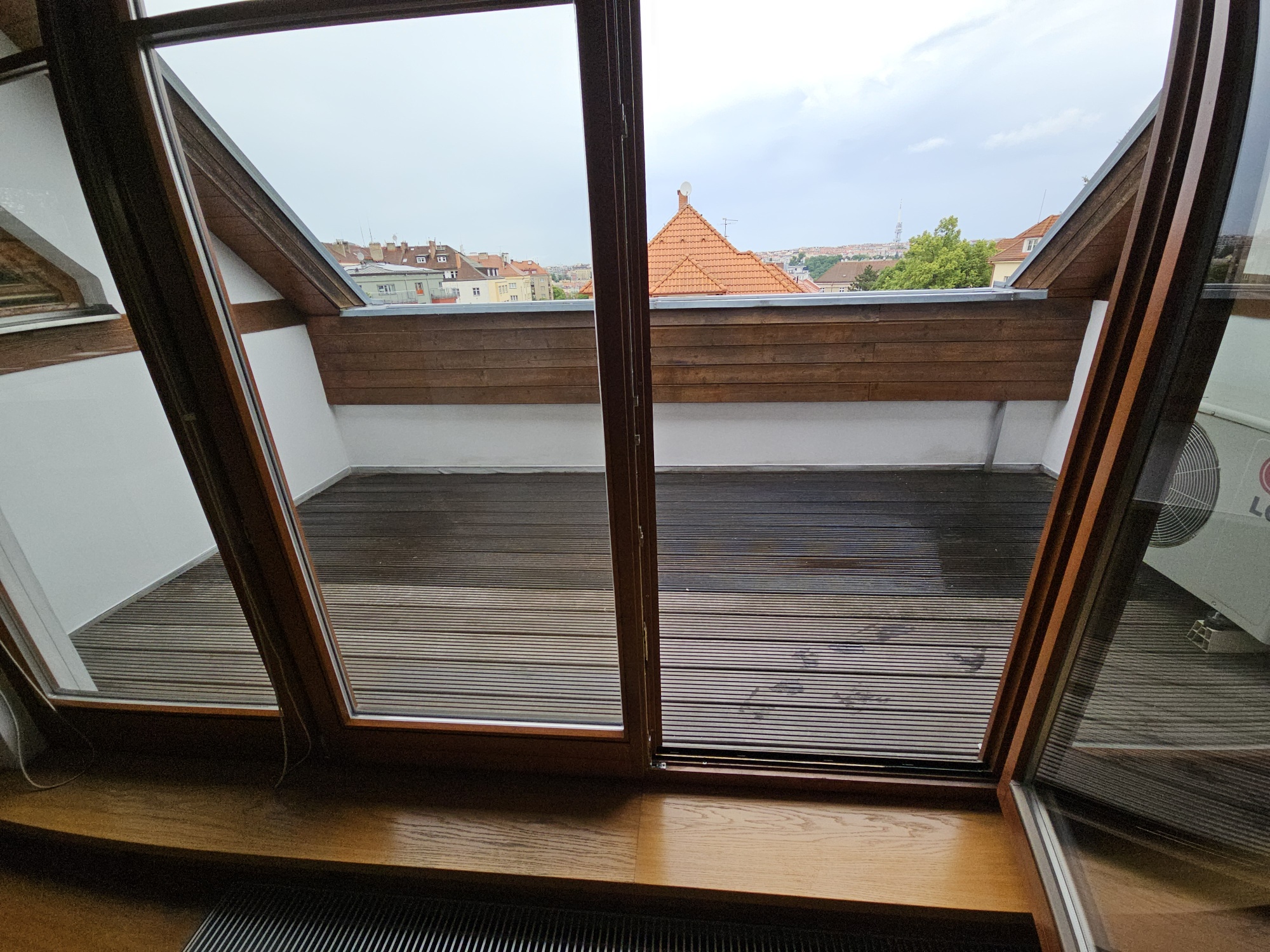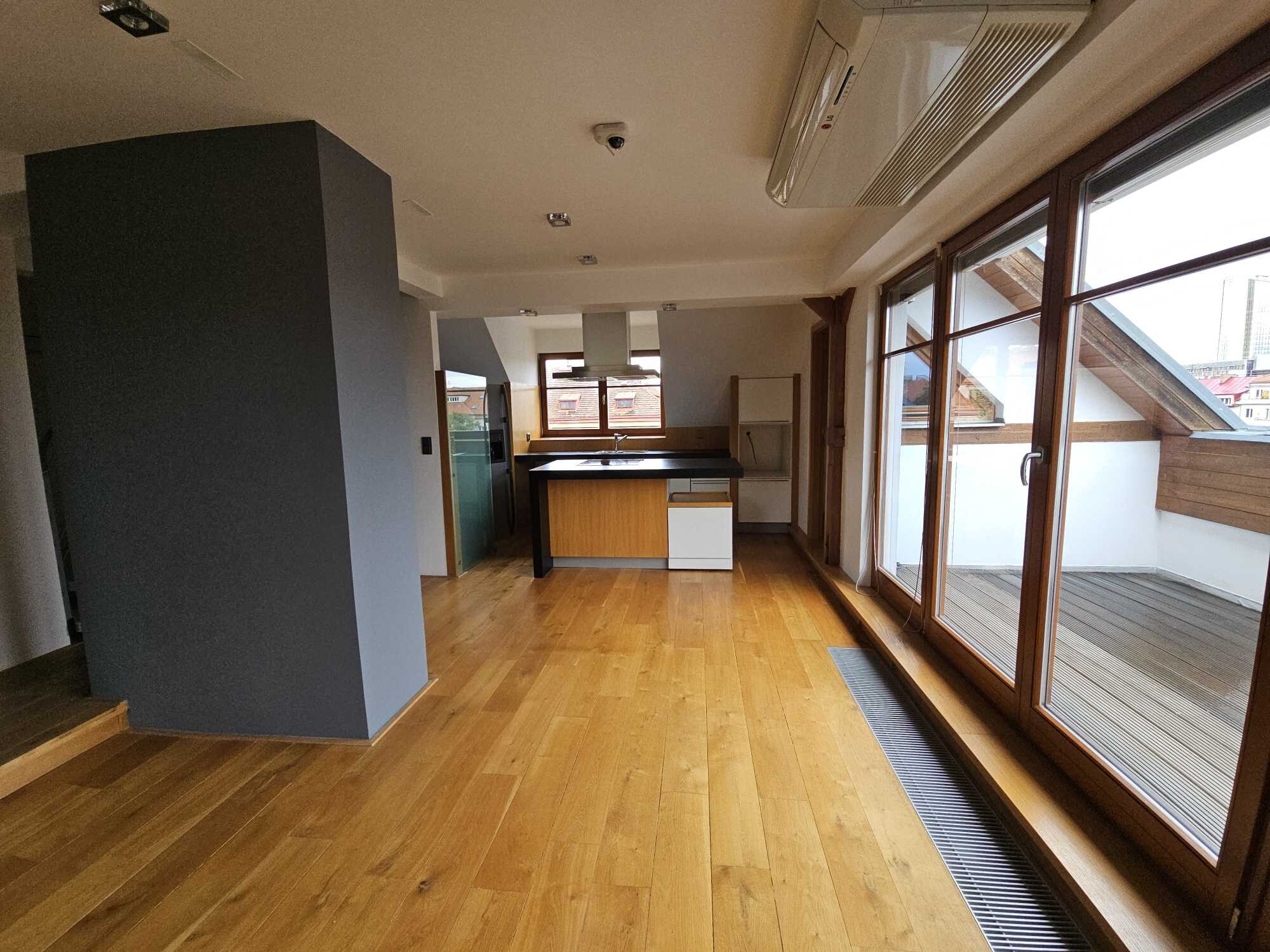 Apartment 3 + kk with accessories (duplex apartment in the attic - built-in attic apartment) is located on the 4th floor of the house without elevator. Heating of the apartment and water heating - gas floor heating (boiler). Windows are plastic, floors wood, tiles and PVC. The apartment is equipped with kitchen, electric stove with hob and extractor hood, after the previous tenant American refrigerator, built-in wardrobes, 2x beds and air conditioning in the apartment. In the larger bathroom there is a bath with mixer tap, 2x washbasin with mixer tap, PET ladder + electric underfloor heating, toilet and bidet, PET boiler, in the smaller bathroom in the maisonette there is a shower with mixer tap, washbasin, toilet and 2x heating ladder. The apartment is not wheelchair accessible. The apartment has a terrace accessible from the living room kitchen. The functionality of the apartment was ensured at the expense of the Prague 4 Municipality. Number of persons proportional to the size of the apartment - 5. Estimated amount of utility bills approx. 3 225 CZK/month/5 persons.