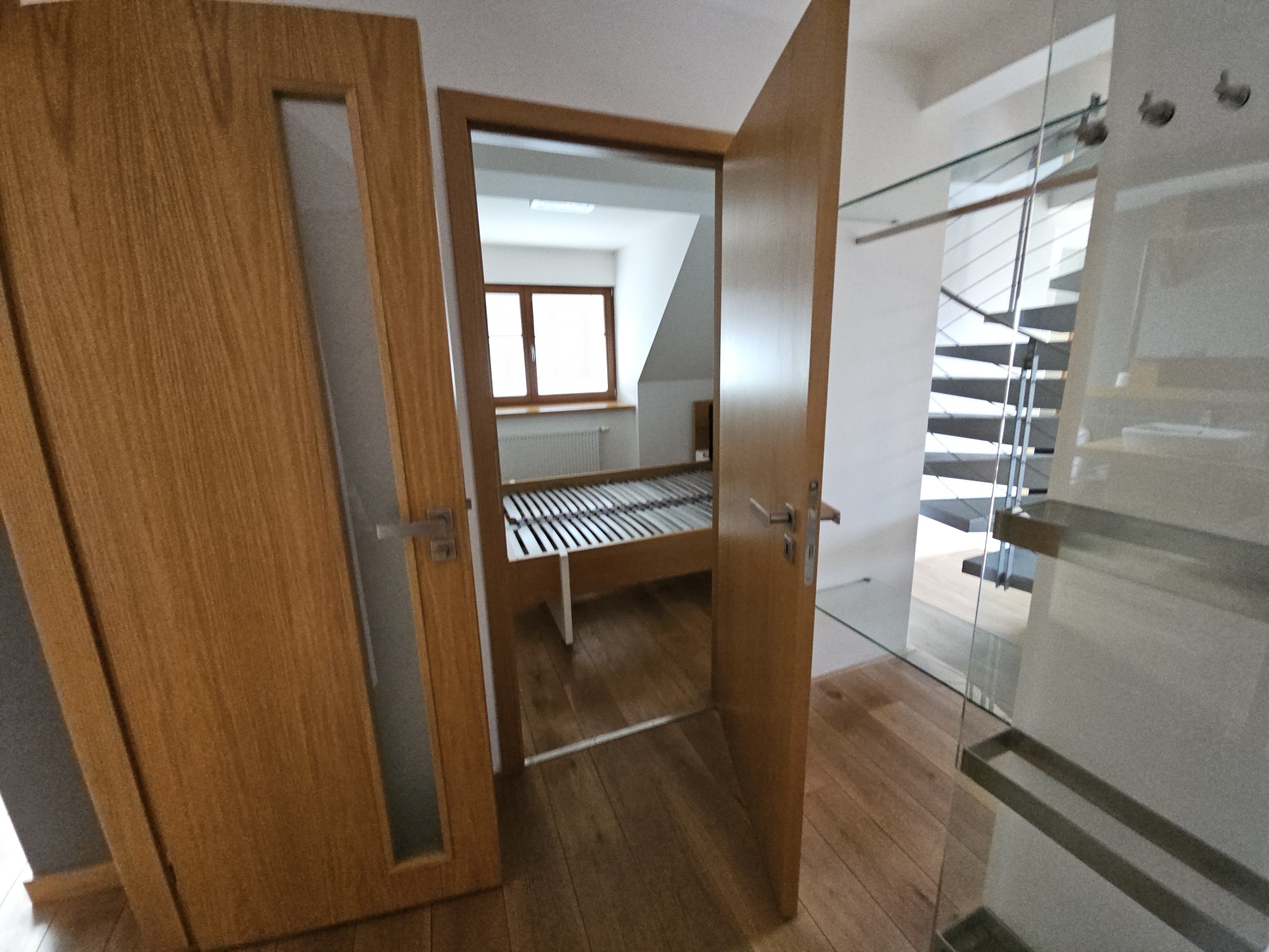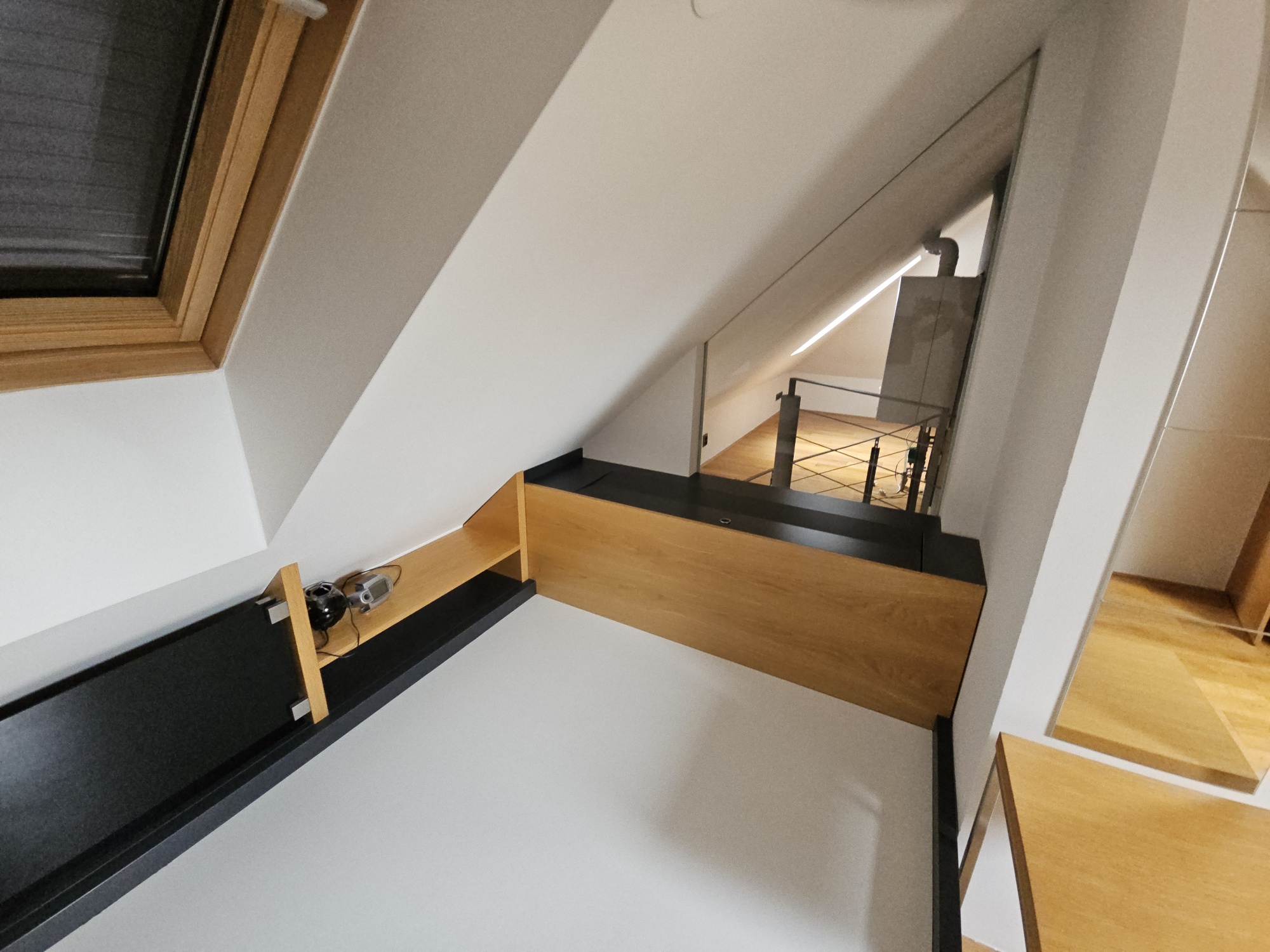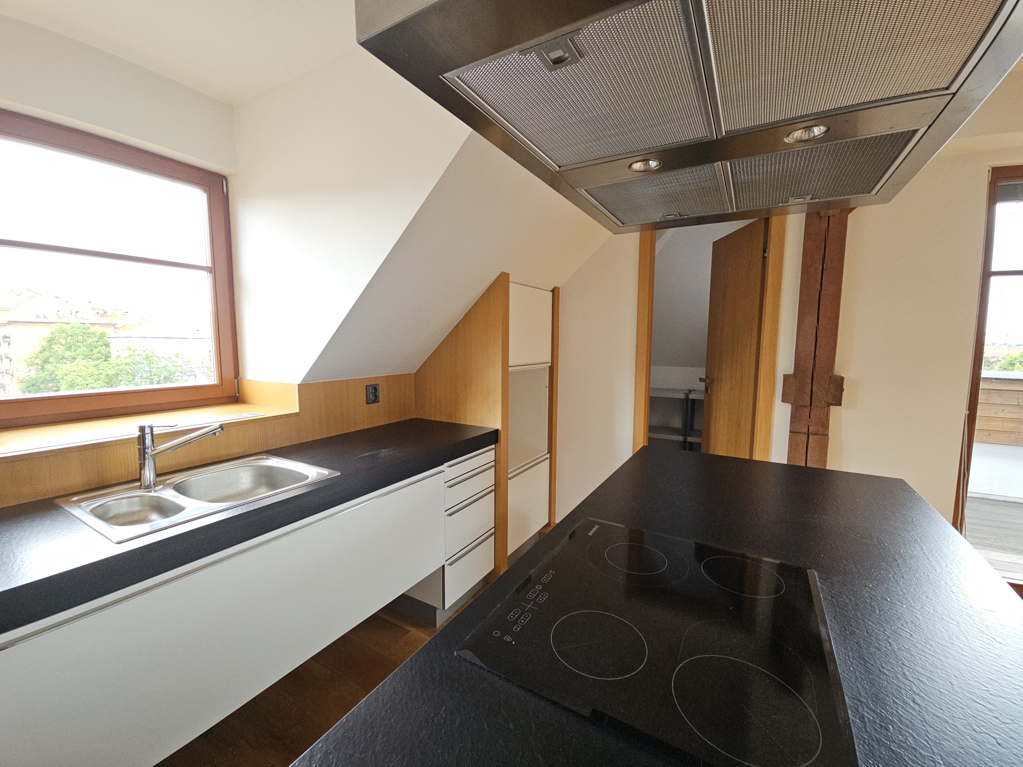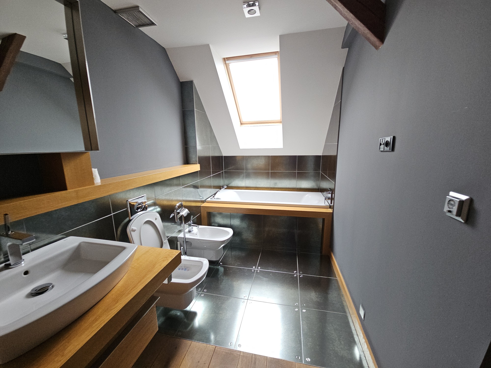 Apartment 3 + kk with accessories (duplex apartment in the attic - built-in attic apartment) is located on the 4th floor of the house without elevator. Heating of the apartment and water heating - gas floor heating (boiler). Windows are plastic, floors wood, tiles and PVC. The apartment is equipped with kitchen, electric stove with hob and extractor hood, after the previous tenant American refrigerator, built-in wardrobes, 2x beds and air conditioning in the apartment. In the larger bathroom there is a bath with mixer tap, 2x washbasin with mixer tap, PET ladder + electric underfloor heating, toilet and bidet, PET boiler, in the smaller bathroom in the maisonette there is a shower with mixer tap, washbasin, toilet and 2x heating ladder. The apartment is not wheelchair accessible. The apartment has a terrace accessible from the living room kitchen. The functionality of the apartment was ensured at the expense of the Prague 4 Municipality. Number of persons proportional to the size of the apartment - 5. Estimated amount of utility bills approx. 3 225 CZK/month/5 persons.